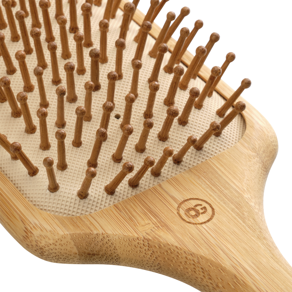 Зробіть свій внесок у комфорт — розплутування та масаж в одному пристрої! Широка поверхня та гнучкі щетинки проникають крізь волосся, одночасно масажуючи шкіру голови, перетворюючи укладання на задоволення. Ідеально підходить для довгого волосся, охоплює більшу площу поверхні для швидкого та легкого процесу. Бамбукова ручка, сертифікована FSC, забезпечує природне, збалансоване відчуття для плавного розчісування. Насолоджуйтесь легким розплутуванням та відчуттям розслаблення.