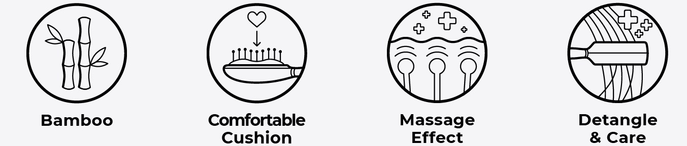 Бамбукові зубці ретельно закруглені на кінцях, щоб запобігти пошкодженню структури волосся або шкіри голови. Торкаючись до шкіри і коріння, м'які зубці масажують, покращуючи кровопостачання. Зручна подушечка забезпечує плавне ковзання та також заспокійливий масаж шкіри голови
