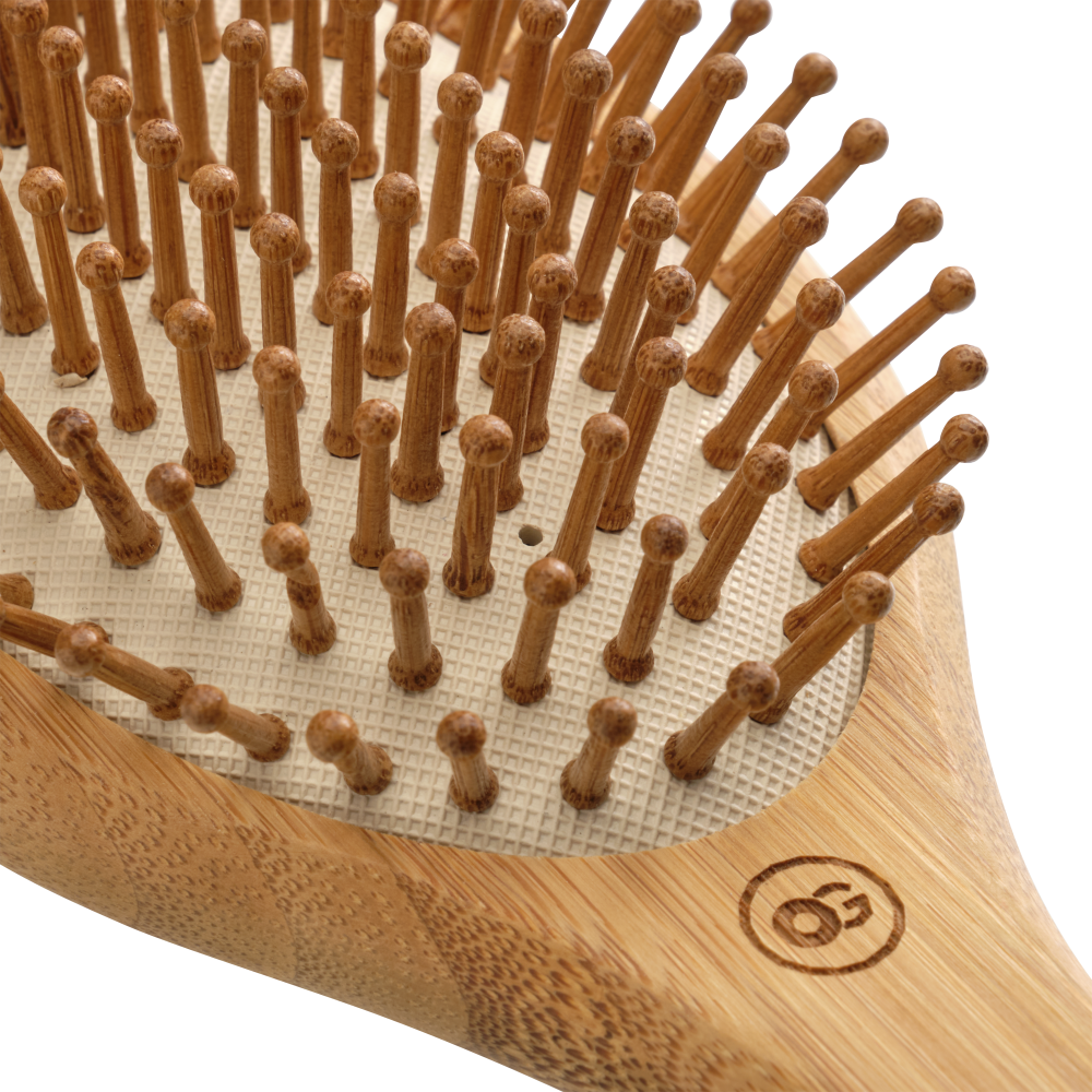 Бамбукові зубці ретельно закруглені на кінцях, щоб запобігти пошкодженню структури волосся або шкіри голови. Торкаючись до шкіри і коріння, м'які зубці масажують, покращуючи кровопостачання. Зручна подушечка забезпечує плавне ковзання та також заспокійливий масаж шкіри голови