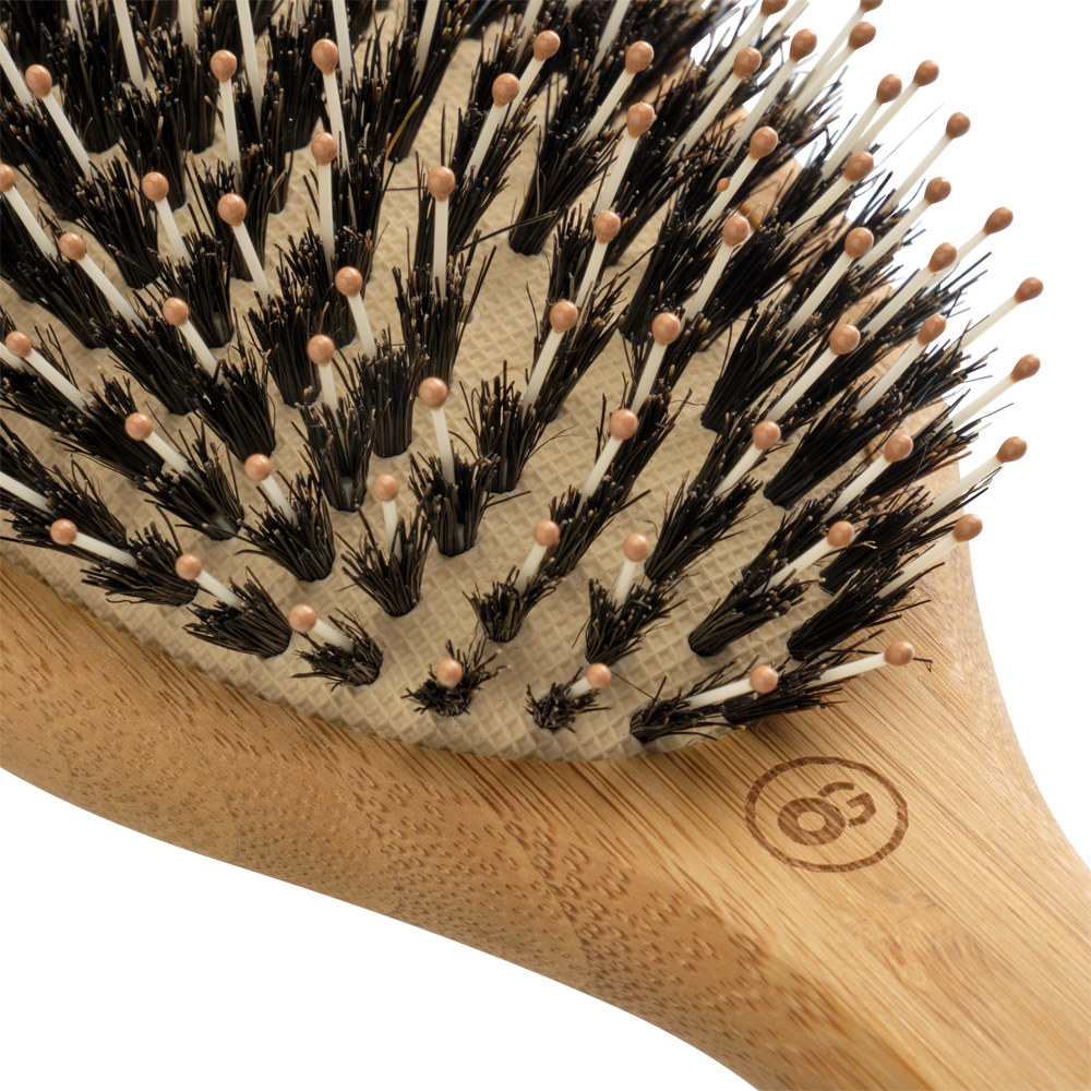 Щетина, опрацьована до дрібниць. У щітці поєднується натуральна щетина кабана і нейлонові зубці. Натуральна щетина дбайливо впливає на волосся і шкіру голови. Нейлонові щетинки ретельно закруглені на кінцях, щоб запобігти пошкодженню структури волосся або шкіри голови. Торкаючись до шкіри і коріння, м'які щетинки масажують їх, покращуючи кровопостачання. Зручна подушечка забезпечує плавне ковзання та також заспокійливий масаж шкіри голови