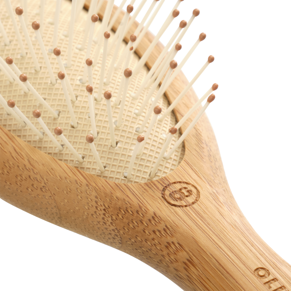 Щетина, опрацьована до дрібниць. У щітці поєднується натуральна щетина кабана і нейлонові зубці. Натуральна щетина дбайливо впливає на волосся і шкіру голови. Нейлонові щетинки ретельно закруглені на кінцях, щоб запобігти пошкодженню структури волосся або шкіри голови. Торкаючись до шкіри і коріння, м'які щетинки масажують їх, покращуючи кровопостачання. Зручна подушечка забезпечує плавне ковзання та також заспокійливий масаж шкіри голови
