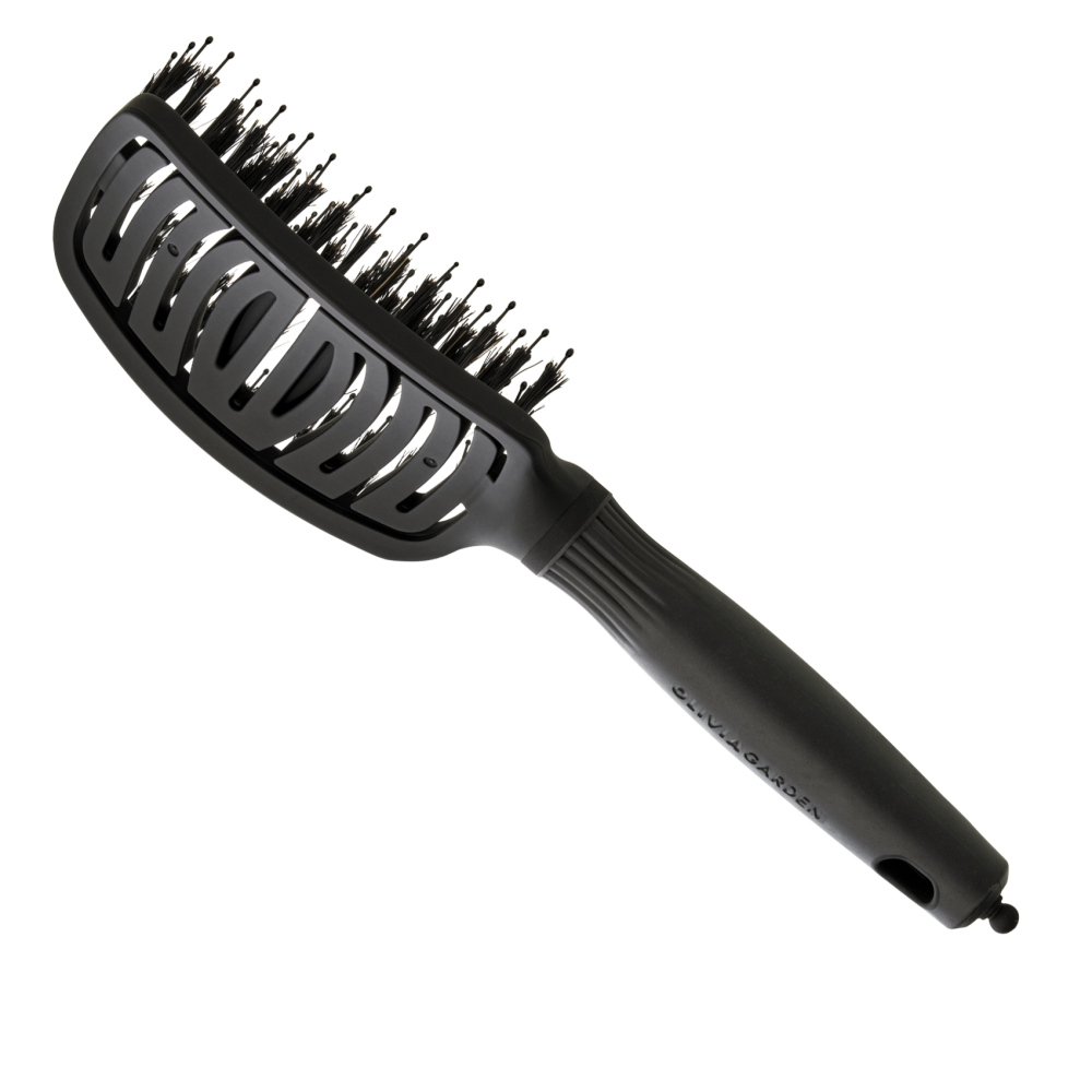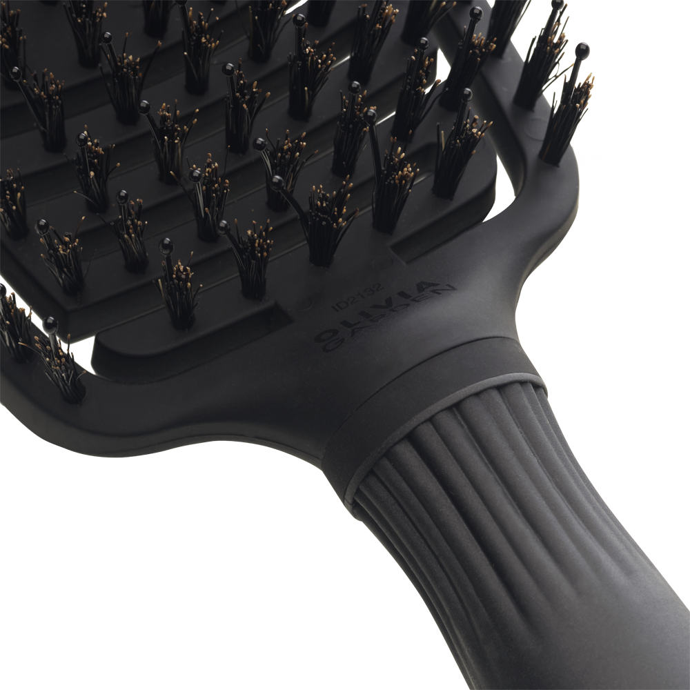 Поєднує в собі надзвичайно гнучкий корпус із нейлоновими щетинками для дбайливого розплутування та щетинками кабана для посилення природного блиску. Відкритий дизайн адаптується до форми шкіри голови, забезпечуючи плавний контроль та поліроване покриття — ідеально підходить для щоденного використання.