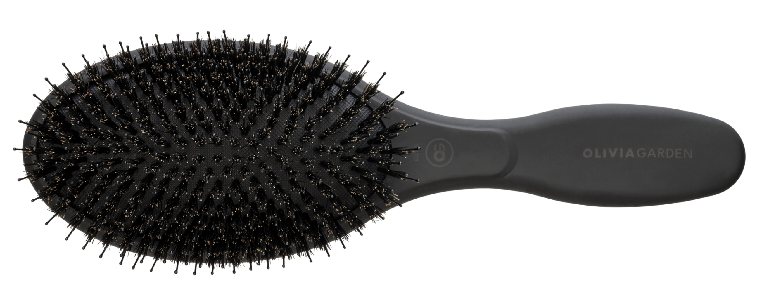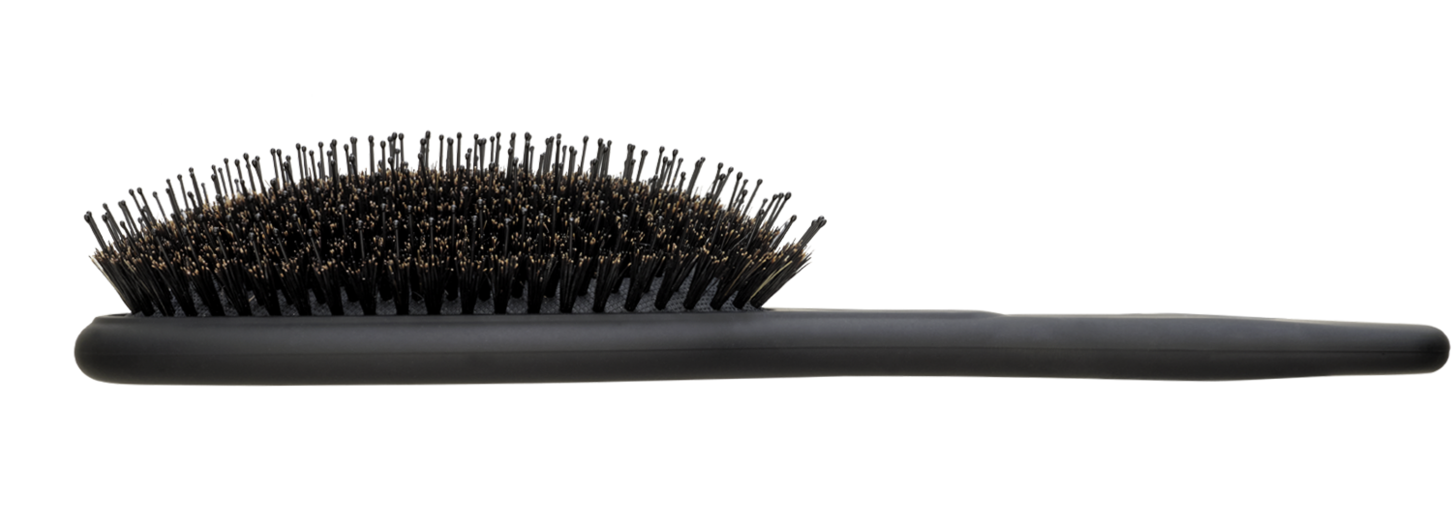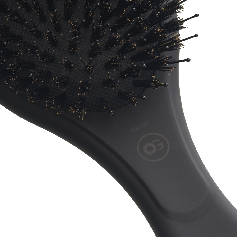 Щетина, опрацьована до дрібниць. У щітці поєднується натуральна щетина кабана і нейлонові зубці. Натуральна щетина дбайливо впливає на волосся і шкіру голови. Нейлонові щетинки ретельно закруглені на кінцях, щоб запобігти пошкодженню структури волосся або шкіри голови. Торкаючись до шкіри і коріння, м'які щетинки масажують їх, покращуючи кровопостачання. Зручна подушечка забезпечує плавне ковзання та також заспокійливий масаж шкіри голови