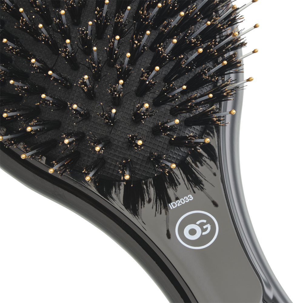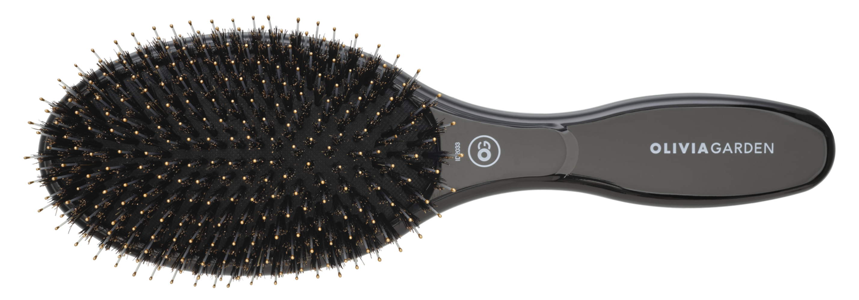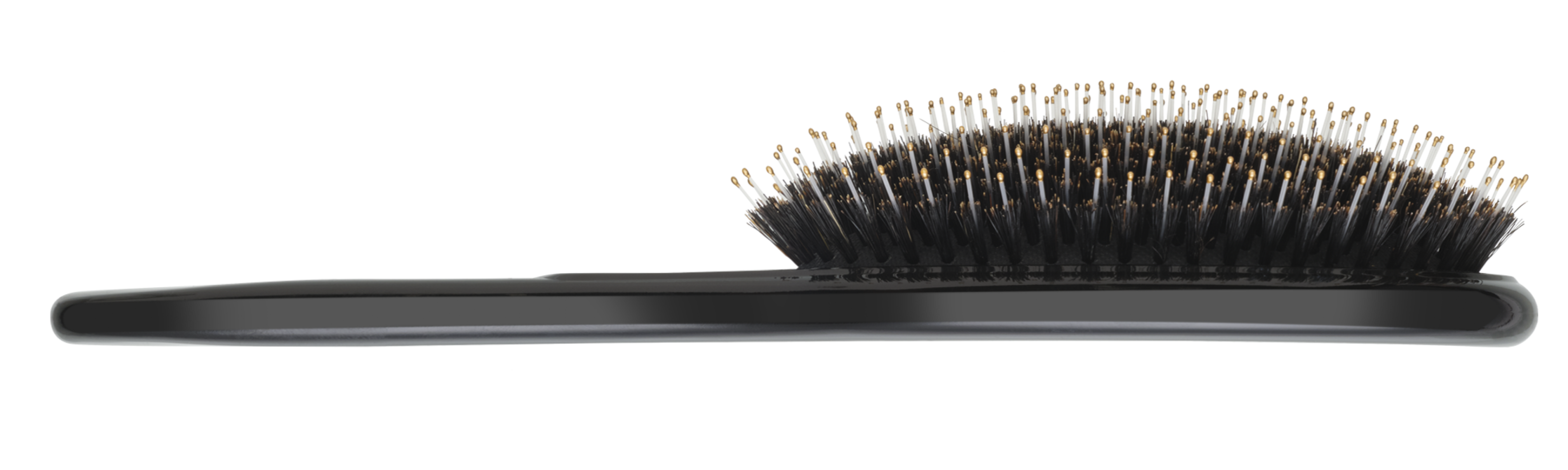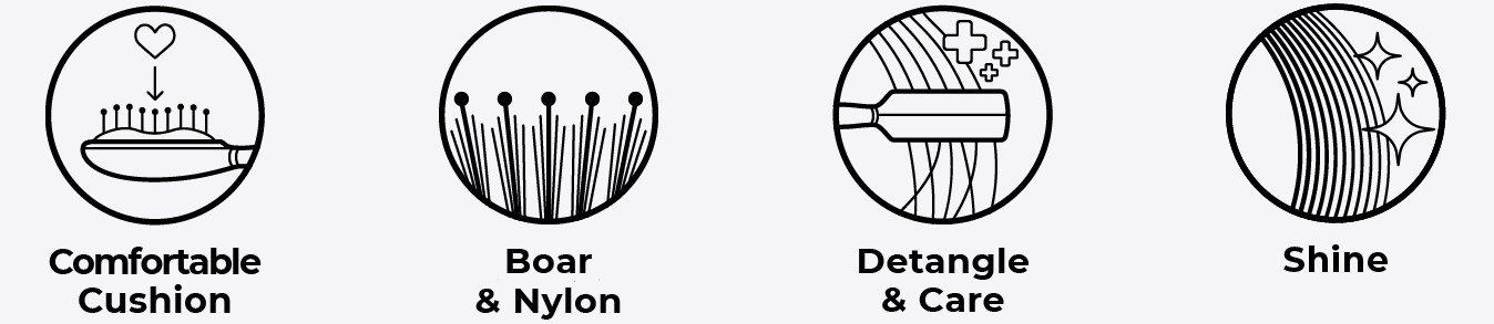 Щетина, опрацьована до дрібниць. У щітці поєднується натуральна щетина кабана і нейлонові зубці. Натуральна щетина дбайливо впливає на волосся і шкіру голови. Нейлонові щетинки ретельно закруглені на кінцях, щоб запобігти пошкодженню структури волосся або шкіри голови. Торкаючись до шкіри і коріння, м'які щетинки масажують їх, покращуючи кровопостачання. Зручна подушечка забезпечує плавне ковзання та також заспокійливий масаж шкіри голови