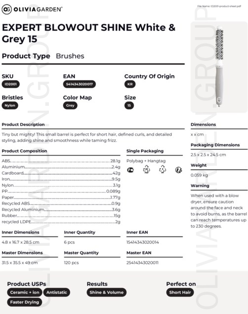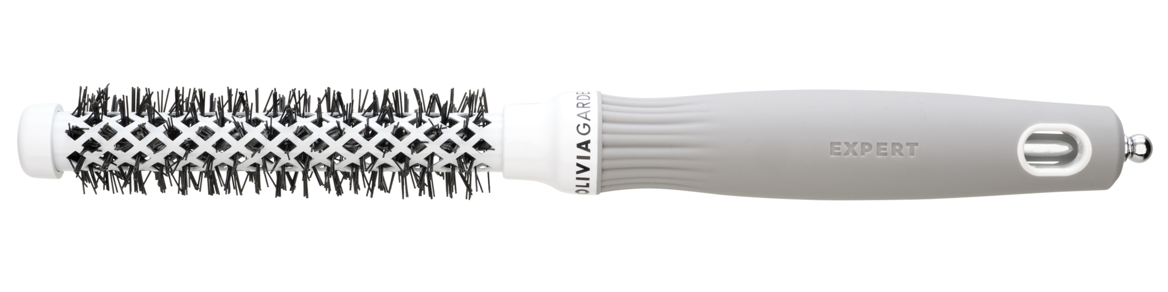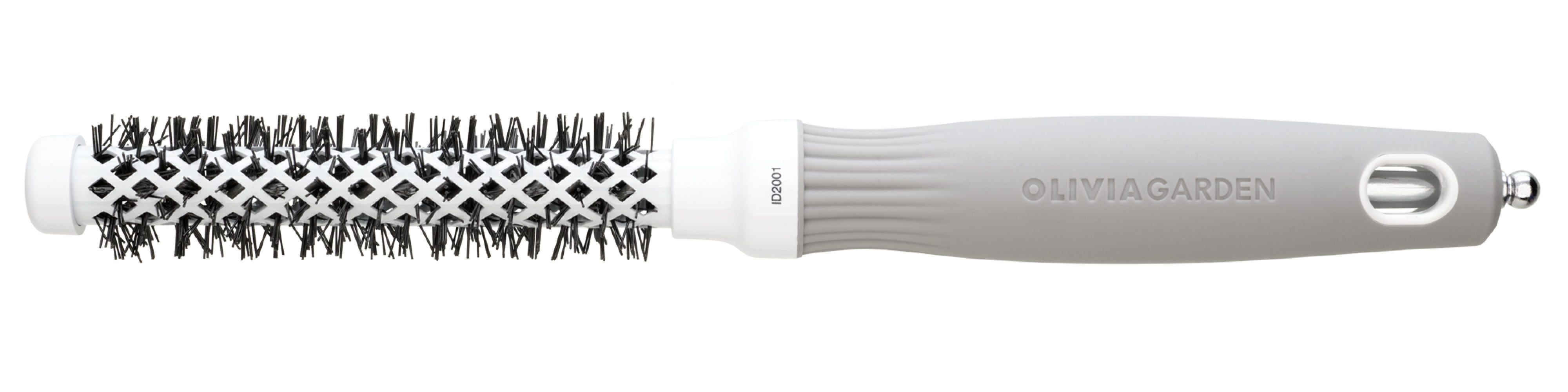 Високоякісний термобрашинг з керамічною поверхнею, збагаченою негативно зарядженими іонами, з щетиною з термостійкого нейлону. Виконаний в біло-сірому кольорі.