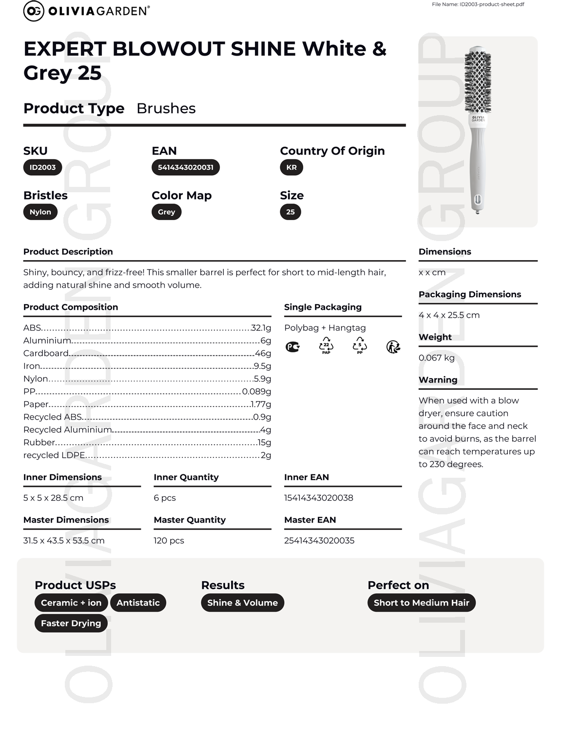 Високоякісний термобрашинг з керамічною поверхнею, збагаченою негативно зарядженими іонами, з щетиною з термостійкого нейлону. Виконаний в біло-сірому кольорі.