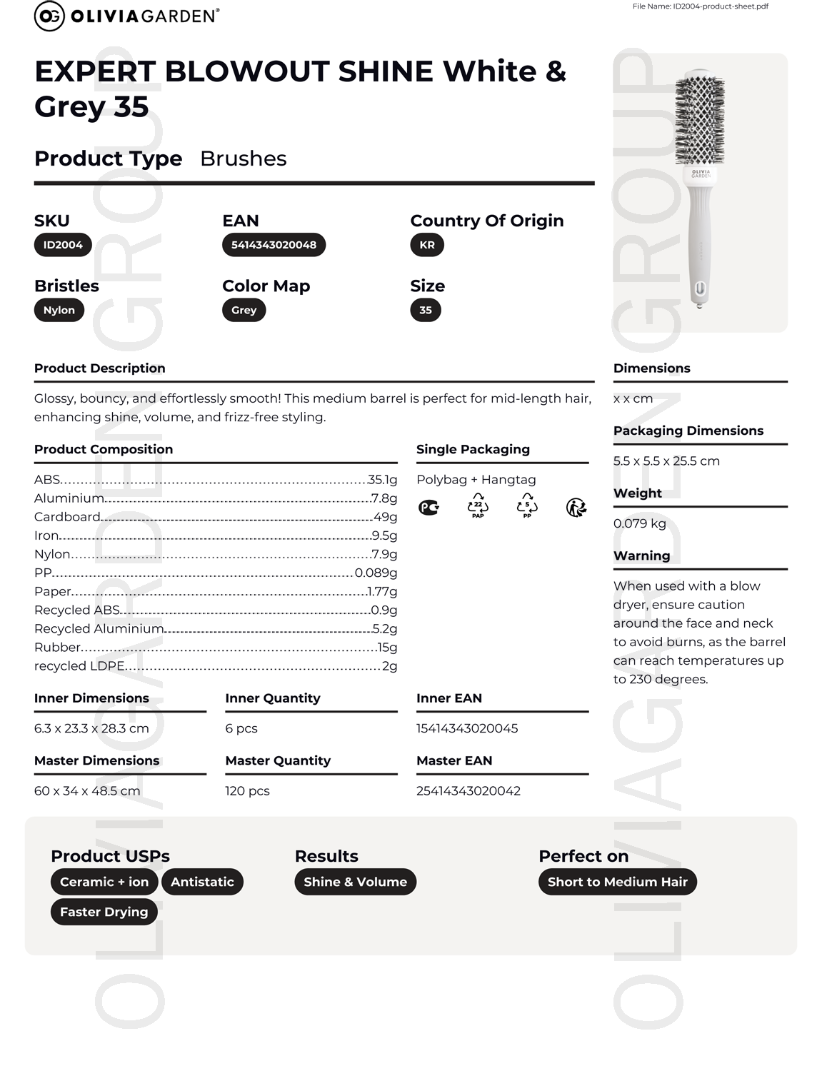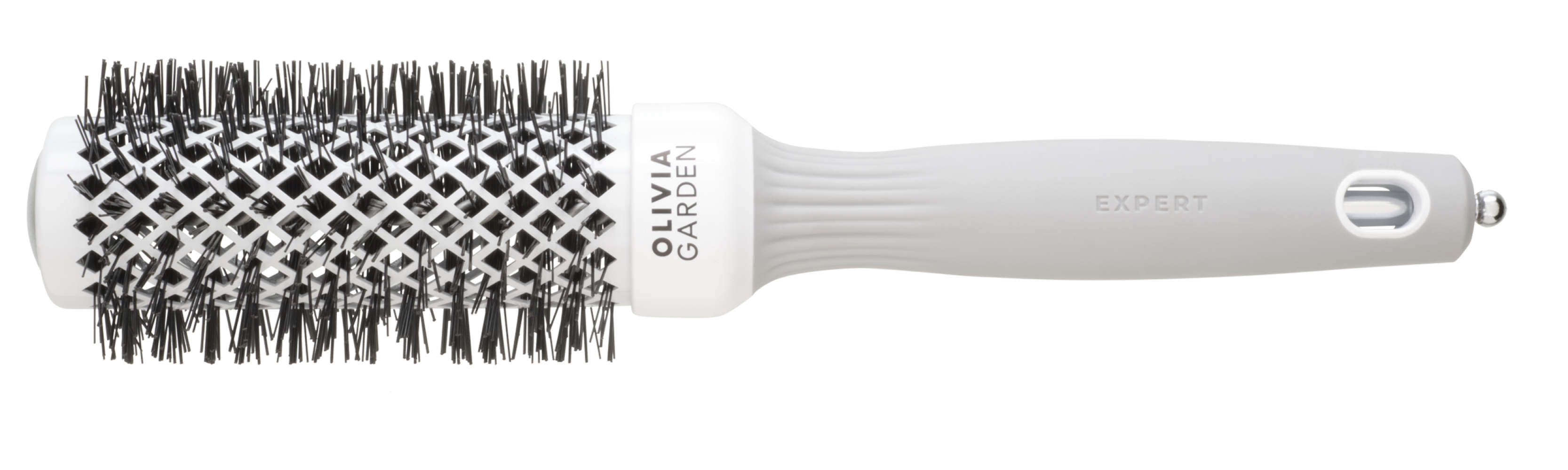 Високоякісний термобрашинг з керамічною поверхнею, збагаченою негативно зарядженими іонами, з щетиною з термостійкого нейлону. Виконаний в біло-сірому кольорі.