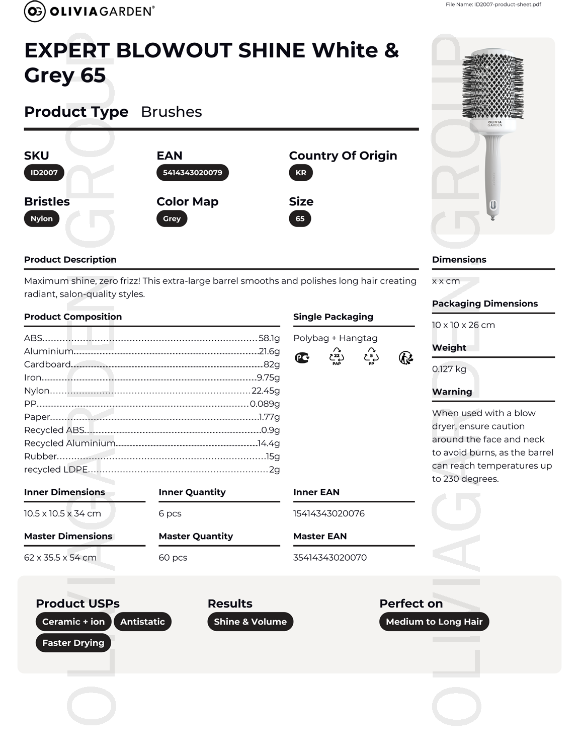 Високоякісний термобрашинг з керамічною поверхнею, збагаченою негативно зарядженими іонами, з щетиною з термостійкого нейлону. Виконаний в біло-сірому кольорі.