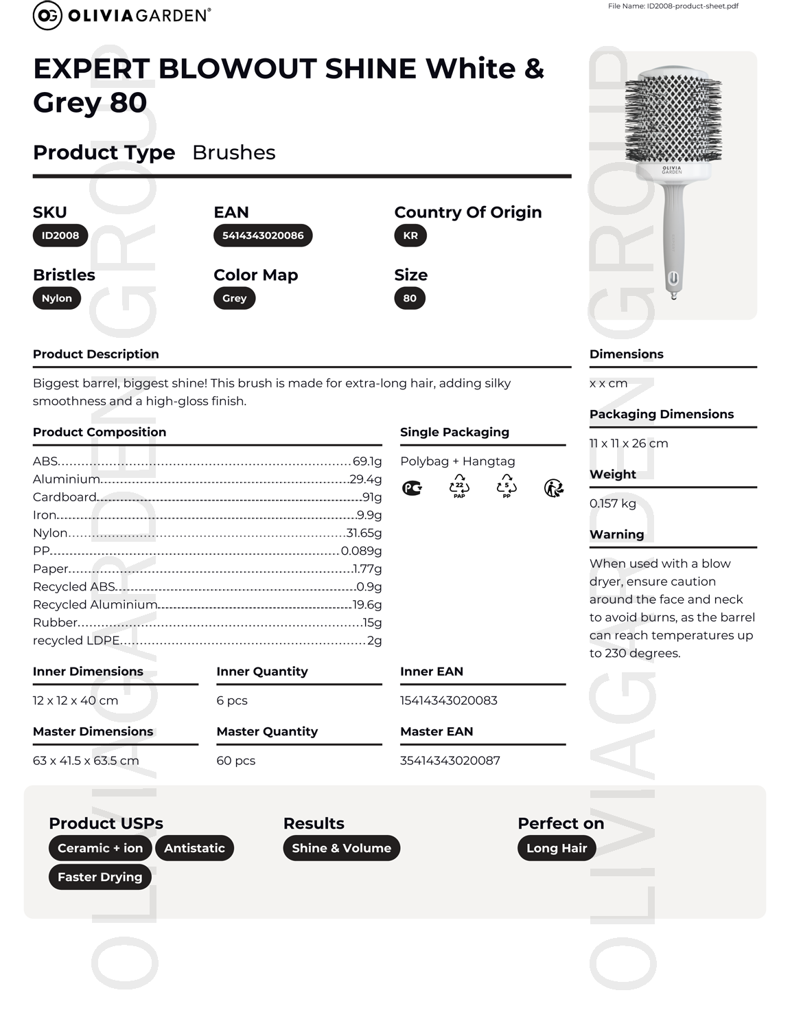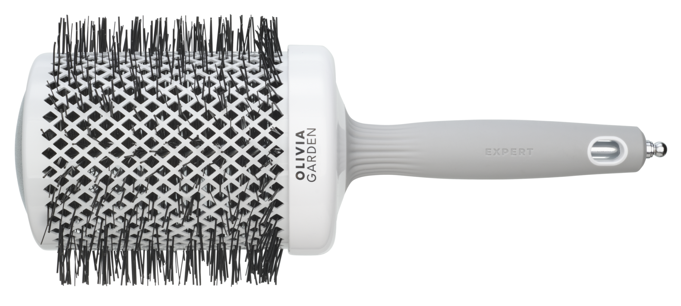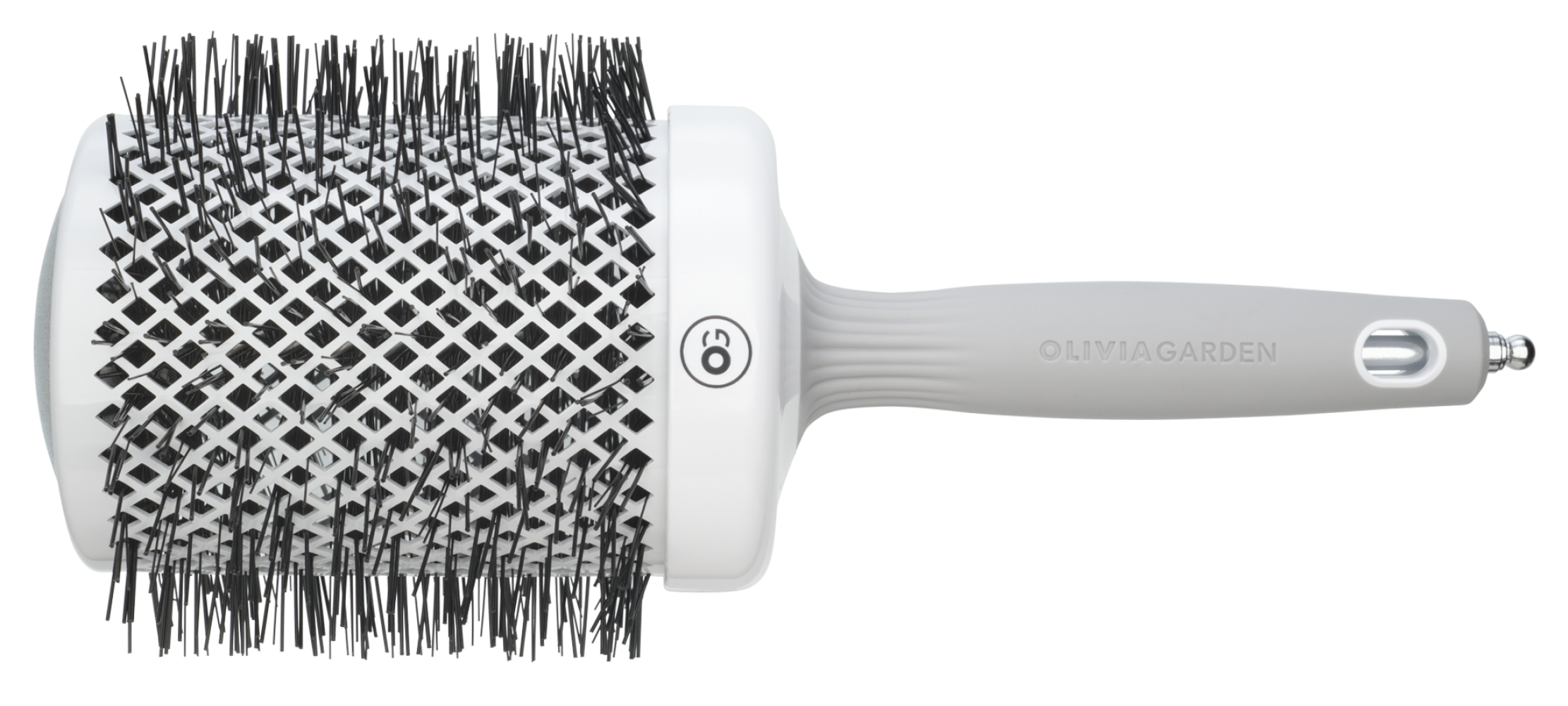 Високоякісний термобрашинг з керамічною поверхнею, збагаченою негативно зарядженими іонами, з щетиною з термостійкого нейлону. Виконаний в біло-сірому кольорі.