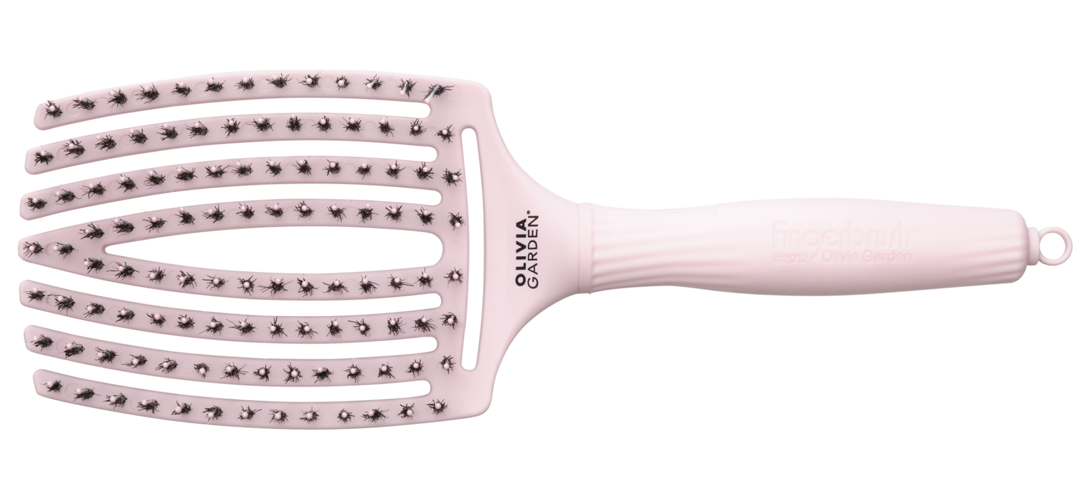 У щітці поєднується натуральна щетина кабана і нейлонові зубці. Натуральна щетина дбайливо впливає на волосся і шкіру голови. Щетина з термостойкого нейлону, має округлі кінчики, які здійснюють приємний, легкий масаж шкіри голови. Щітка ідеально підійде власникам чутливої шкіри голови. Щетинки дбайливо розчісують волосся, надаючи стимулюючу дію на прикореневу зону, запобігаючи заплутуванню волосся. Масажна щітка Finger Brush допоможе створити ідеальну зачіску як в салоні так і в домашніх умовах!