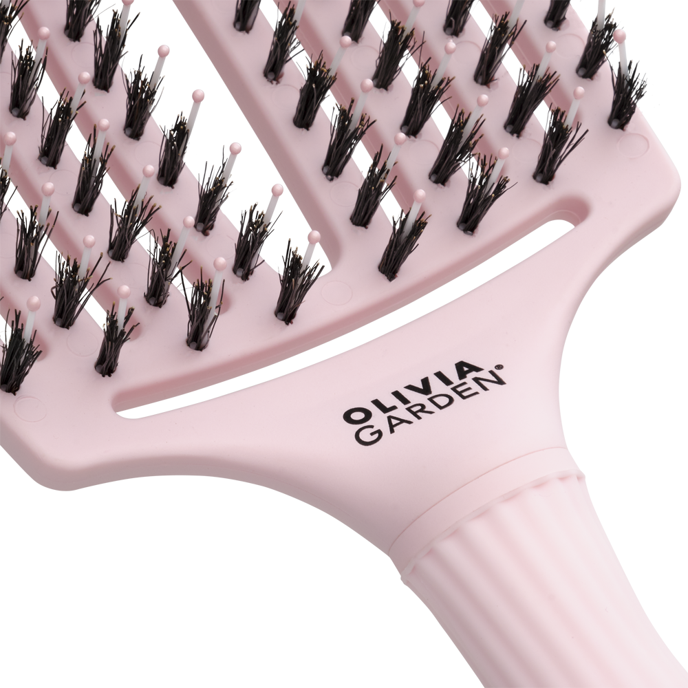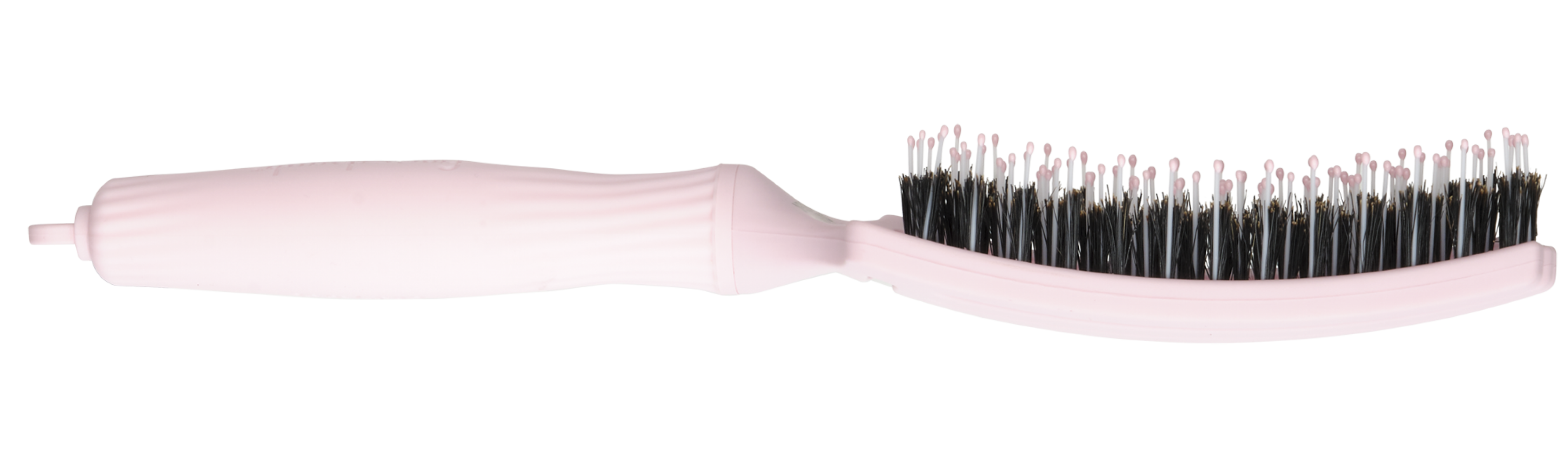 Гнучкі щетинки, схожі на пальці, делікатно розділяють вузлики, зменшуючи натяг і ламкість для безболісного розчісування. Щетина з кабана та нейлону додає блиску, контролює пухнастість і робить волосся гладеньким і полірованим. Вигнута форма повторює рухи шкіри голови для легкого розчісування. Ідеально підходить для довгого волосся – рекомендується для сухого волосся.