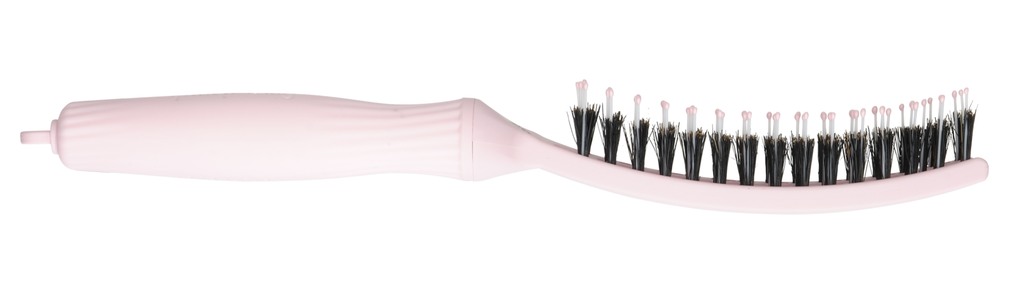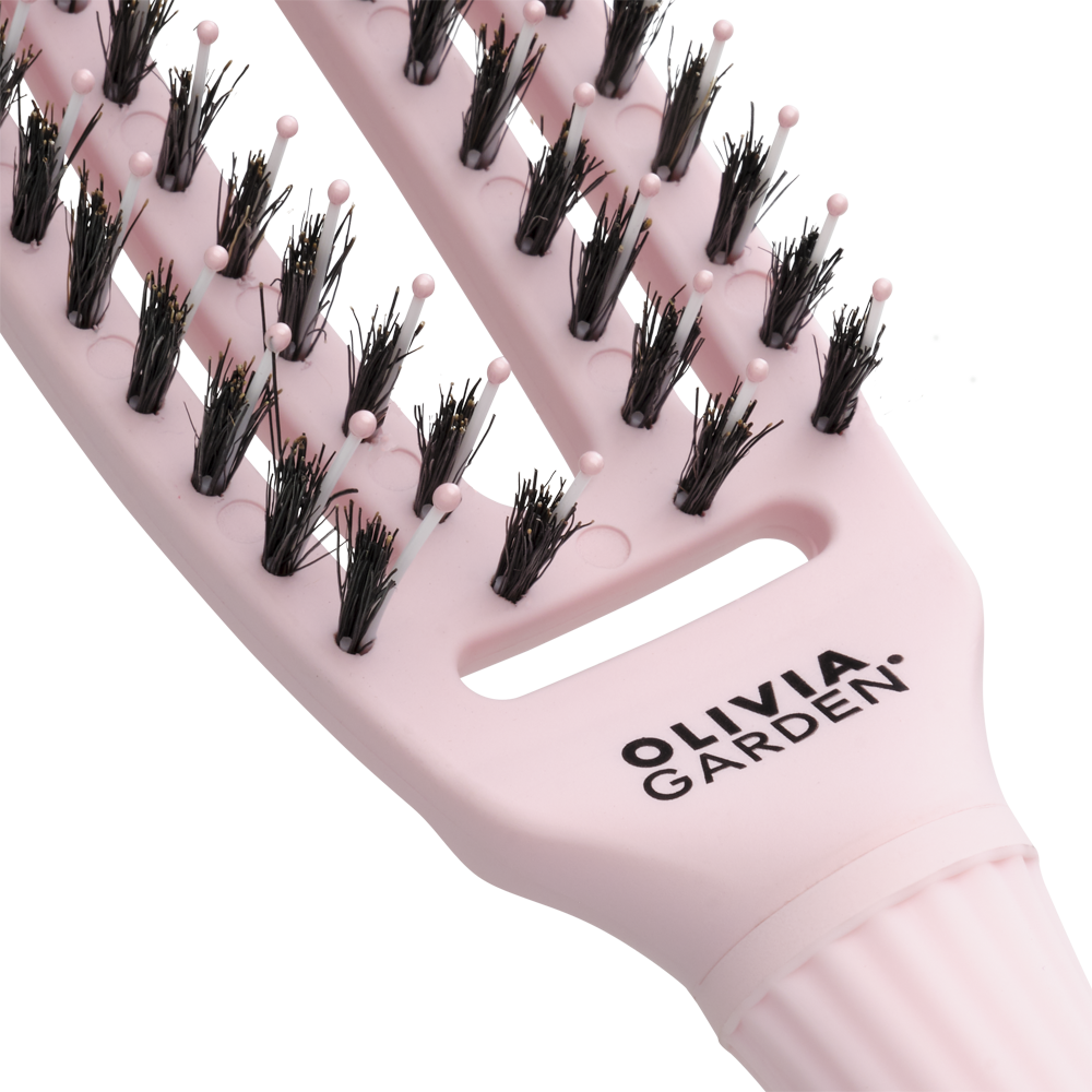 Гнучкі щетинки, схожі на пальці, делікатно розділяють вузлики, зменшуючи натяг і ламкість для безболісного розчісування. Щетина з кабана та нейлону додає блиску, контролює пухнастість і робить волосся гладеньким і полірованим. Вигнута форма повторює рухи шкіри голови для легкого розчісування. Ідеально підходить для короткого волосся – рекомендується для сухого волосся.