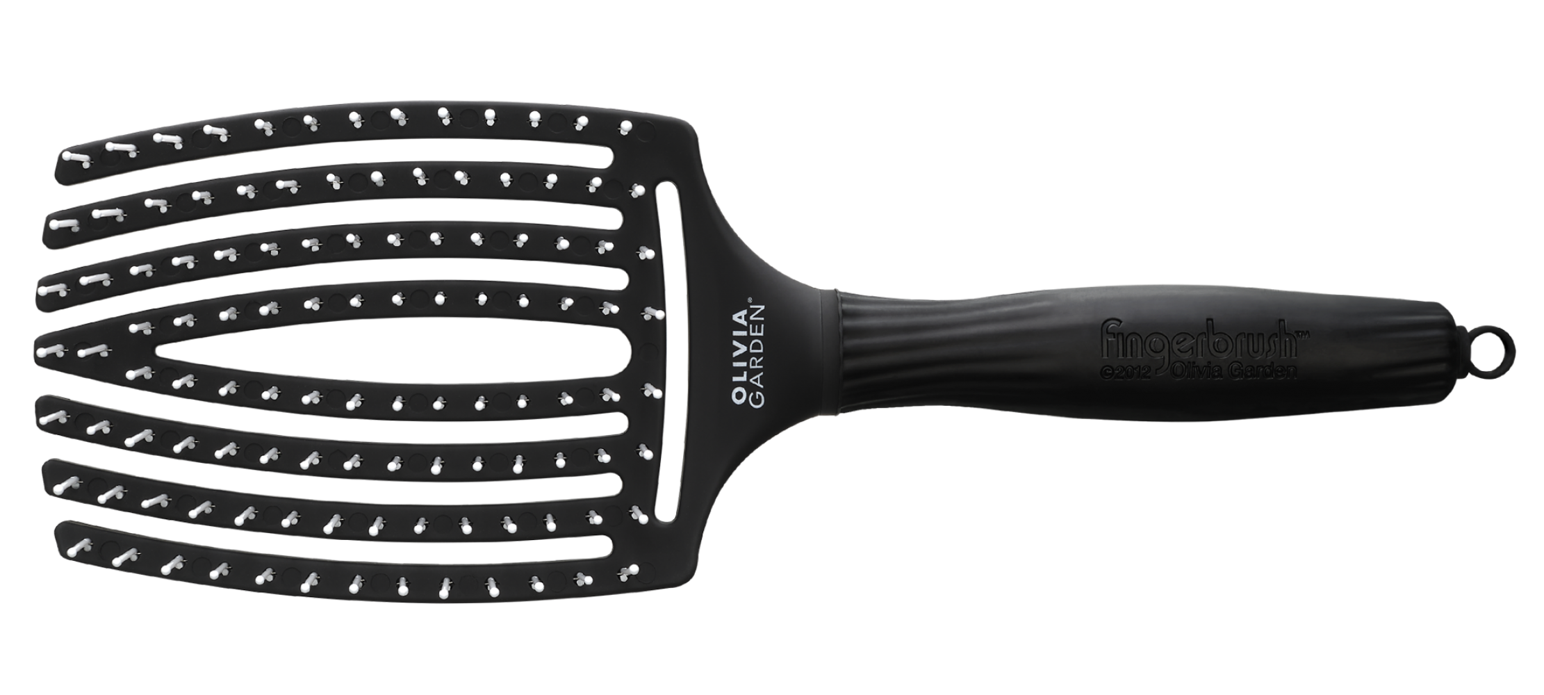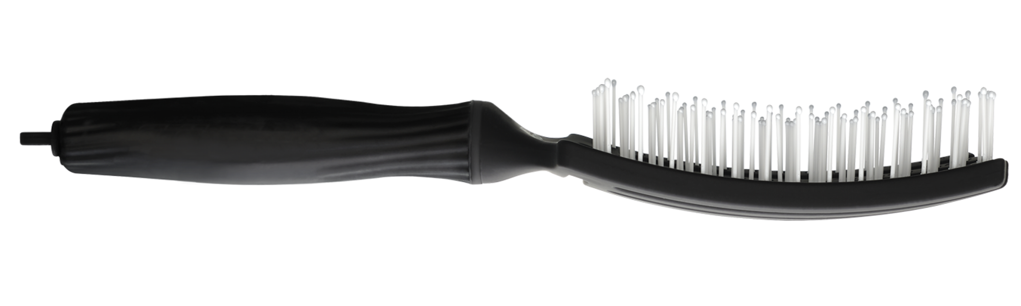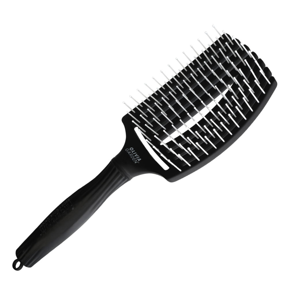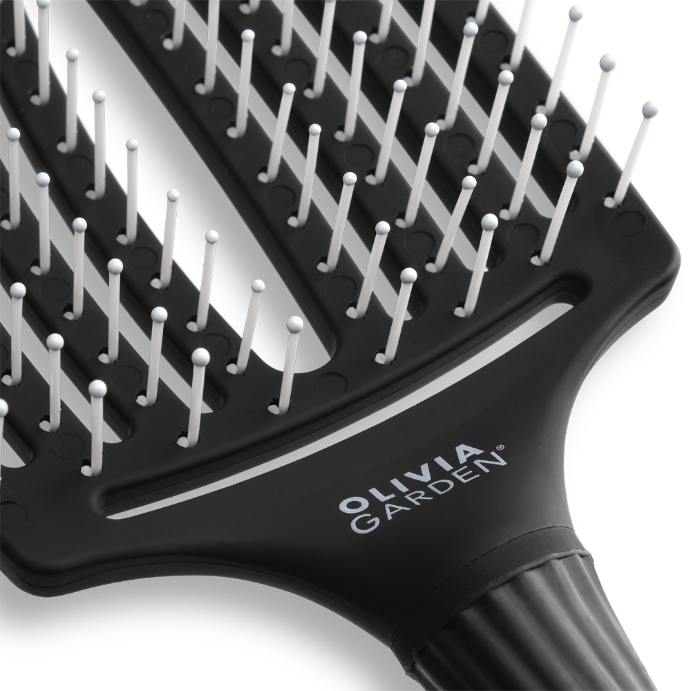 Щітка для волосся Olivia Garden ID1394 в чорному кольорі має вигнуту форму, що повторює вигин голови.